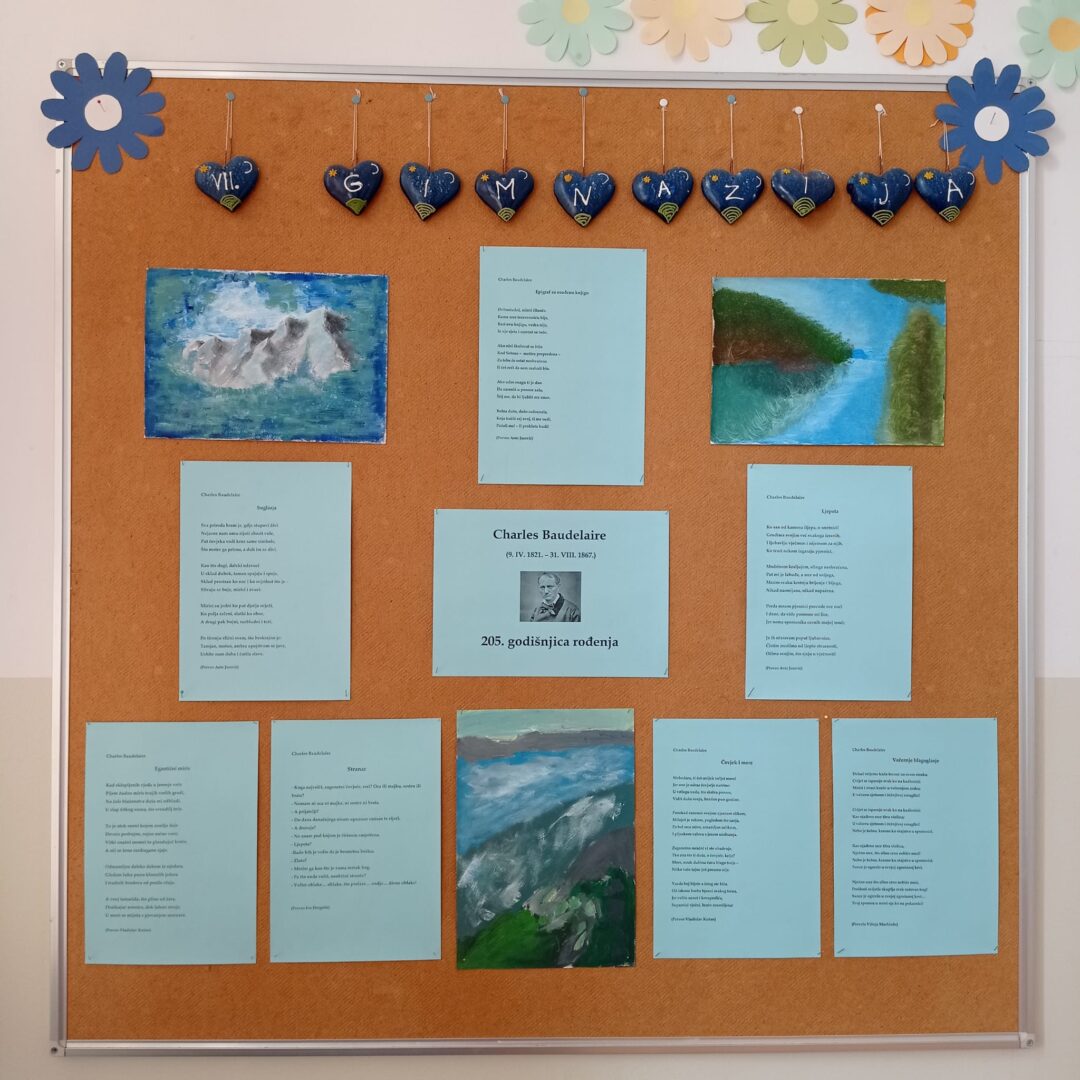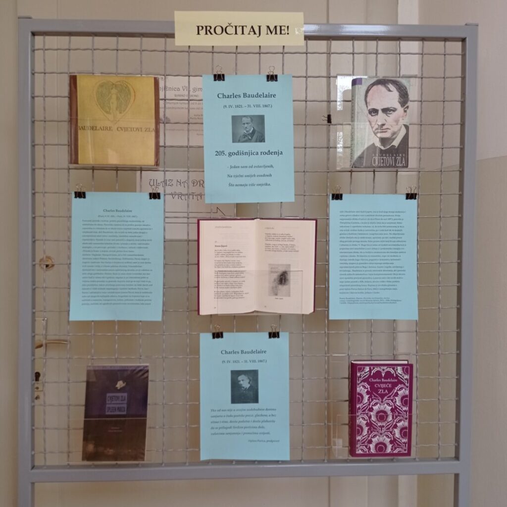 Prošli četvrtak smo obilježili 205. obljetnicu rođenja istaknutog modernističkog pjesnika Charlesa Baudelairea. Priredili smo malu prigodnu izložbu u čitaonici, a o njegovu životu te utjecaju njegova stvaralaštva na gotovo sve kasnije modernističke pravce slušali su učenici 4.c, 3.c, 1.e i 1.f.