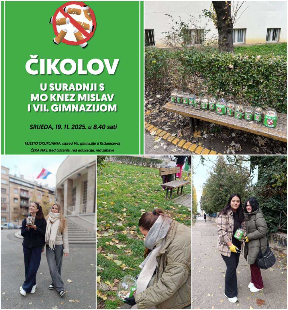 19. 11. su učenici 3.c i 2.a te učenici koji pohađaju izvannastavnu aktivnost iz građanskog odgoja i obrazovanja ZAG sudjelovali u ekološkoj akciji čišćenja okoliša Škole od opušaka cigareta „Čikolov“. Pohvaljujemo učenike na angažmanu i prikupljenih 5500 čikova cigareta u samo pola sata koliko je trajala akcija. Moramo postati svjesni da naš okoliš nije pepeljara već naš dom i da se opušci bacaju u predviđena mjesta, a ne na pod.