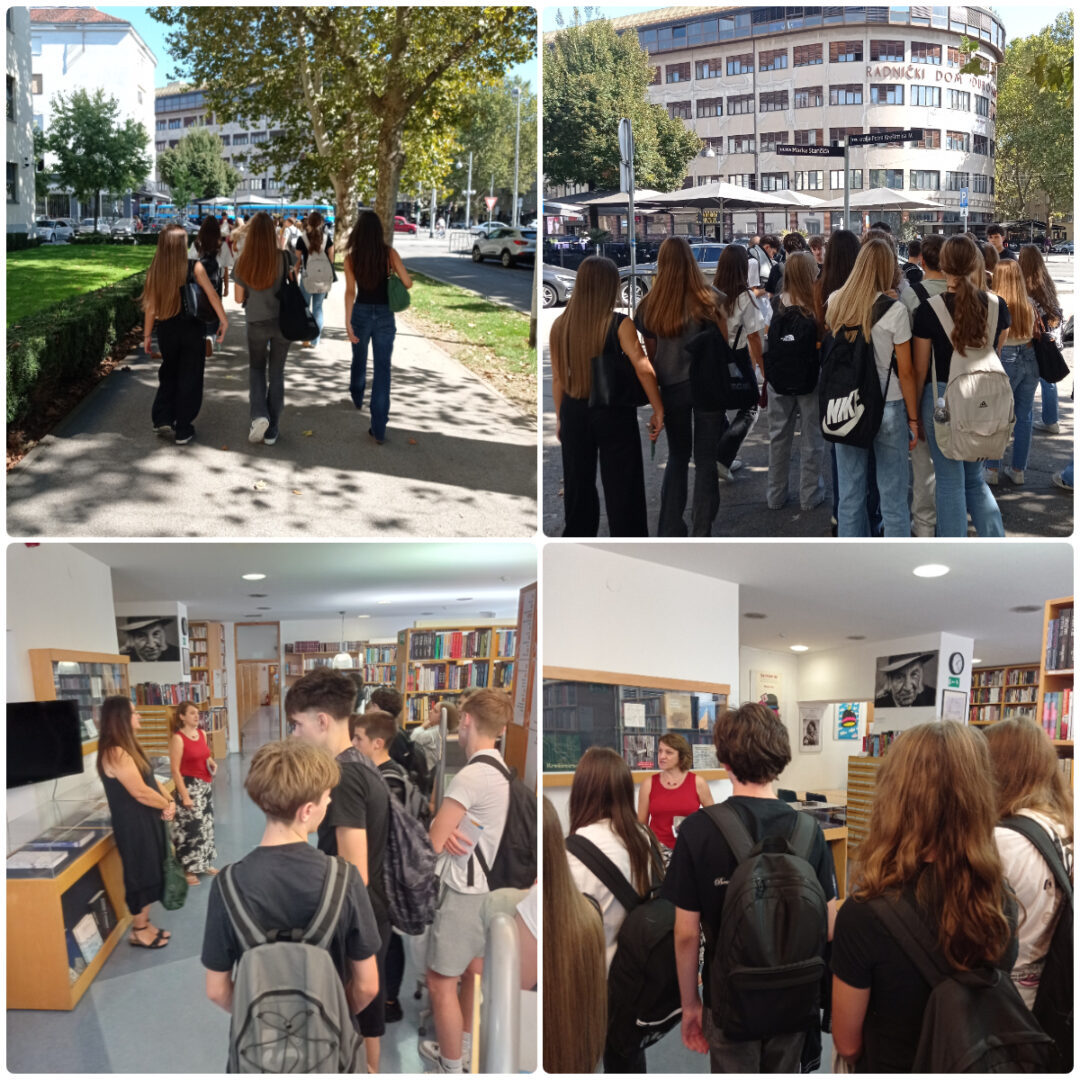 Učenici 1.b s razrednicom Cmiljkom Sivrić, prof. i knjižničarkom Lidijom Dizdar posjetili su prošli tjedan Knjižnicu Božidara Adžije. Šetnjom do obližnje narodne knjižnice na simboličan način dali su svoj doprinos obilježavanju Europskog tjedna mobilnosti koji se održavao od 16. do 22. rujna s temom Mobilnost za sve. Knjižničarka Milkica Ursa dočekala je naše učenike na informativno-posudbenom odjelu Knjižnice i upoznala ih ukratko s njihovim radom i uslugama. Provela ih je potom zatvorenim spremištem te im predstavila aktualne izložbe. O problemima izbjeglištva postavljena je izložba plakata ReD, a lijep uvod u Dane europske baštine posvećene graditeljskoj baštini bila je izložba „Kako arhitektura oblikuje budućnost: Knjižnica na Trgu kralja Petra Krešimira IV.“