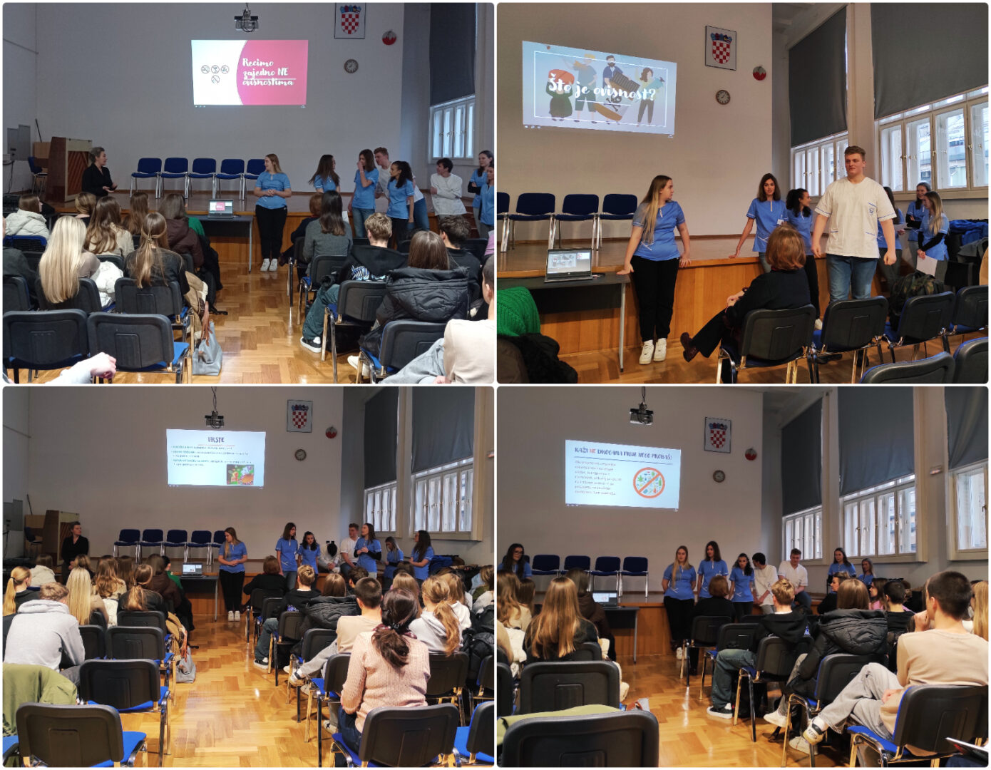 Povodom Mjeseca borbe protiv ovisnosti u goste su nam došli učenici Medicinske škole Vinogradska. Pod mentorstvom Ines Gregurević, mag. med. techn., učenicima 1.e i 1.f održali su danas radionicu „Recimo zajedno ne ovisnostima!“ Prvo su pitali naše prvaše što misle o ovom ozbiljnom problemu, potom su im detaljnije govorili o sredstvima i vrstama ovisnosti, štetnim zdravstvenim te socijalnim posljedicama. Posebno su se zadržali na ovisnostima o nikotinskim proizvodima, kockanju, alkoholu, drogama i internetu. Naši učenici pažljivo su slušali i aktivno sudjelovali, a na kraju su provjerili svoj odnos prema korištenju interneta i društvenih mreža.