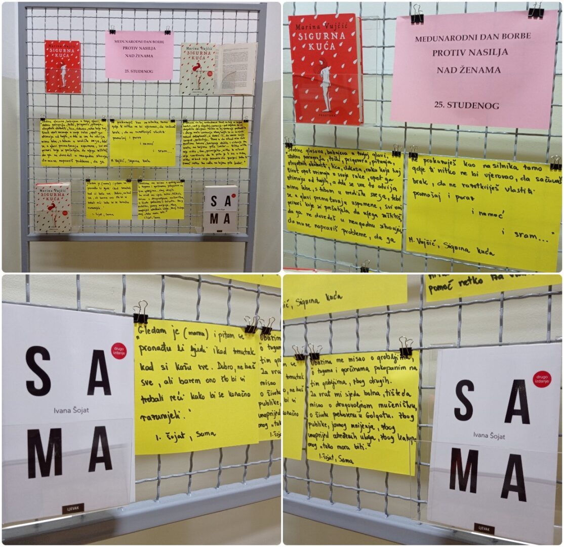 Skroman doprinos obilježavanju Međunarodnog dana borbe protiv nasilja nad ženama dala je i naša knjižnica. Knjižničarke su izložile učenički plakat i odabrane tekstove iz romana “Sigurna kuća” i “Sama” hrvatskih autorica Marine Vujčić i Ivane Šojat. O tome zašto se baš 25. studenoga obilježava taj dan govorile su učenicima 2.e koji su sa zanimanjem slušali o sestrama Mirabal, političkim aktivisticama koje je diktatorski režim pogubio 1960. u Dominikanskoj Republici. Potom su slušali ulomke iz djela spomenutih autorica, a tiču se osobnih proživljavanja glavnih junakinja, njihovih skrivenih patnja, odnosa njihovih bližnjih i društva. Da priča o njima nije “književni slučaj”, nego “stvarnost koja se tiče svih nas”, istaknula je Marina Vujčić u svojoj zahvali na kraju romana “Sigurna kuća”, a o tome je pretprošle godine razgovarala s našim učenicama na Festivalu svjetske književnosti.