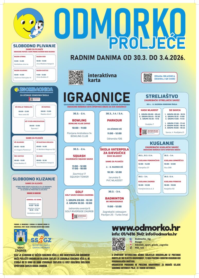 Školski sportski savez Grada Zagreba tijekom proljetnog odmora učenika od 30. ožujka do 3. travnja 2026. organizira program Odmorko proljeće.