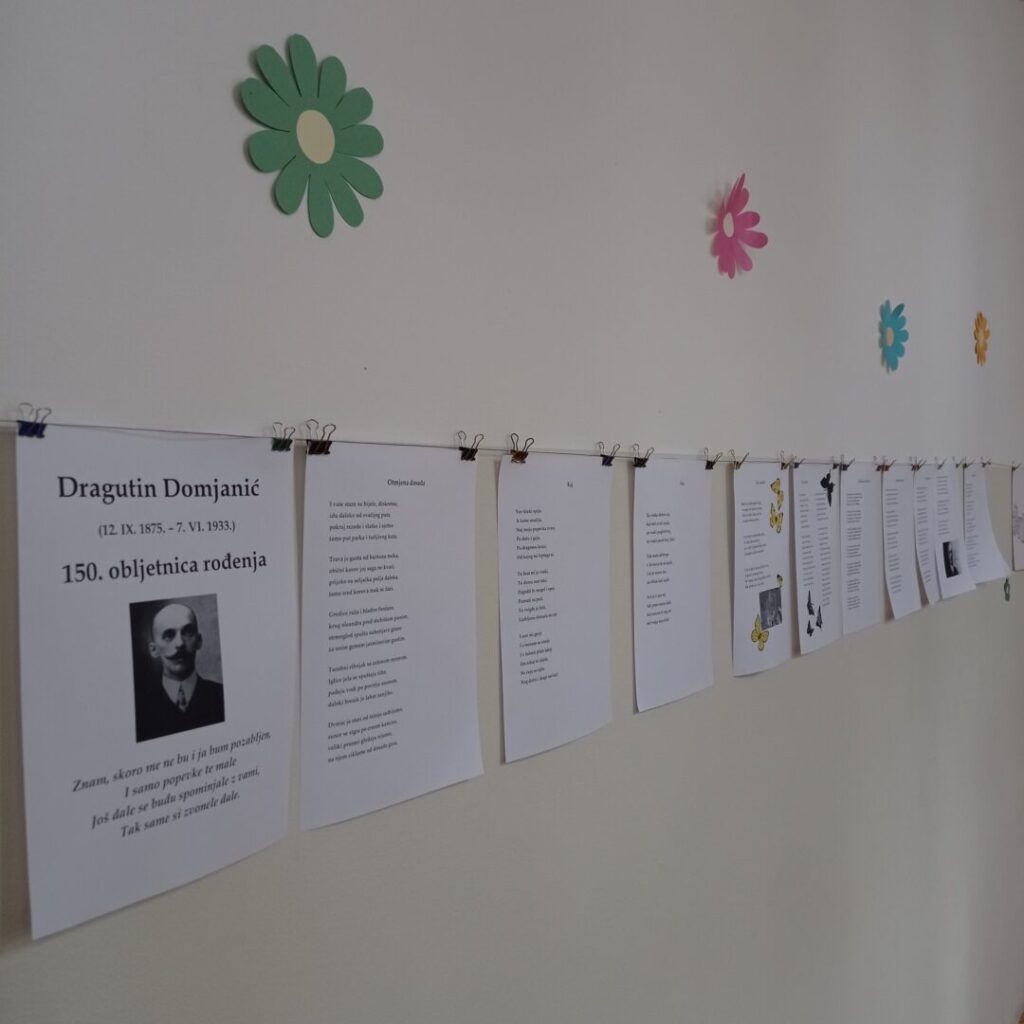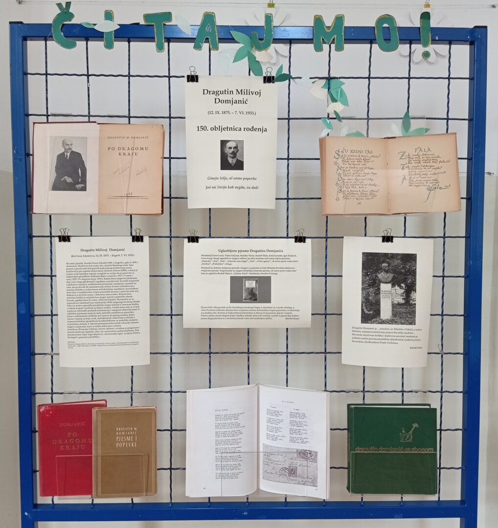 Izložbom knjiga i tekstova pridružili smo se mnogima koji tijekom rujna nisu zaboravili 150. rođendan hrvatskog pjesnika Dragutina Domjanića. Posjetitelji knjižnice i čitaonice, osobito učenici prvih i drugih razreda, slušali su o njegovu životu te pokoji lijep i melodiozan stih što tiho “diši”, oživljujući spomenak na pjesnika čije popevke “Još dale se budu spominjale z vami, /Tak same si zvonele dale.”